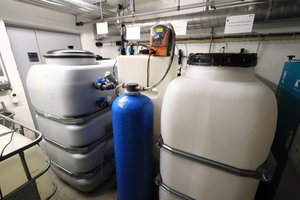 L’eau passe ensuite dans un filtre tourbillon permettant de séparer les matières solides des liquides. Puis, les liquides passent dans une enceinte cylindrique (tonneaux recyclés) comprenant des paquets de billes d’argiles et de pouzzolane entourés de moustiquaire qui constituent ainsi les « nids » des bactéries. Ce sont des substrats poreux qui vont pouvoir accueillir les bactéries. Au fond de cette enceinte, plusieurs bulleurs sont installés afin d’apporter de l’oxygène et de garantir des conditions aérobies. L’étape finale est le passage de l’eau chargée en bactéries dans de longs tubes en PVC montés en parallèle dans lesquels des plantes pourront être plongées. Les trous fait dans ces tubes de PVC sont en quinconce afin que les plantes ne se touchent pas les unes des autres.